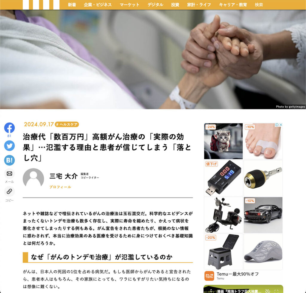 講談社『マネー現代』にて弊社が制作した記事が公開されました。 がん宣告をされた患者たちが、根拠の...